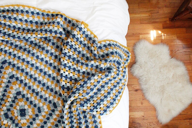 This particular granny square blanket, with instructions that include color changes, is available in 4 sizes: